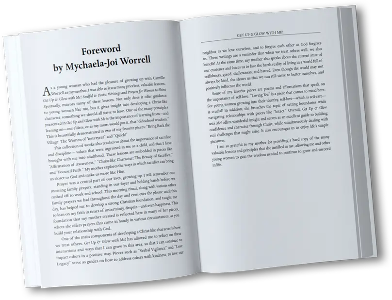 Get Up & Glow with Me is a collection of soulful & poetic writings and prayers that present a creative snapshot of God’s gifts to us, His love for us, and His expectations for our lives. It begins by painting a candid picture of society today. Then, through vivid, personal experiences and examples, the author invites women to discover their true beauty from within, which stems from Christ-like character. In turn, women can become deeply in tune to God’s desires for their lives. As a result, their total existence is lovingly enhanced as God becomes the center of their being. Women are now destined for a deep everlasting relationship of love from our Creator, a love that effortlessly spreads to others. Get up and go with me and grow with me, as we rise to glow for God on this dynamic journey of spiritual rejuvenation!